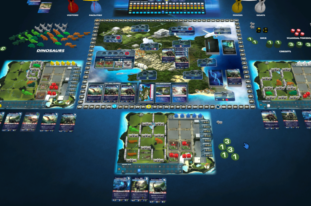 You start with a mostly empty park—just room for 2 visitors, 4 fences with which you can make your first pen, and a few cards, both DNA and Manipulation. Depending on turn order, you also have a few starting credits. You skip most of the pre-round minutiae (Open Season) in round 1, going right to the meat of each round: worker-placement. You collect or sell DNA cards, use DNA cards to make dinosaurs, build facilities, fences, play Manipulation cards for powerful one-time effects, etc. At the end of the round, carnivorous dinosaurs must be fed goats, unhappy dinosaurs rampage (possibly destroying facilities or eating visitors), then you collect points from your dinosaurs and visitors and ready for the next round. After the first round, you then follow several steps for Open Season which involves determining player order for the new round, gaining new visitors based on turn order, making money from those visitors, and processing the next Breaking News (events).