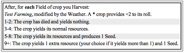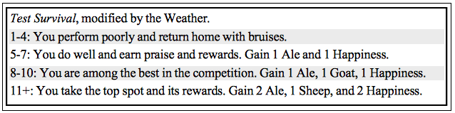 In the above table, you can see a good example of the average chart for rolling tests. There is a small range for really poor results, but it doesn’t take much to avoid those. In essence, if you’re good at the skill, you’ll almost never fail (but many activities are modified by the weather, so nasty weather can hinder even skilled characters). It also means that small, incremental modifiers serve a purpose. A +1 might be all you need to reach the next tier of result and get a better outcome. In many games, a +1 in a pass/fail system will rarely, if ever, make a difference. But they can immediately be of use in this system as they can nudge you out of the range of bad results.
