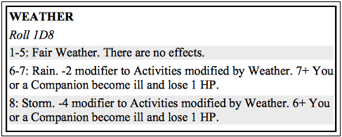 At the start of each Week, you’ll roll for the Weather to see if and how it impacts your activities.