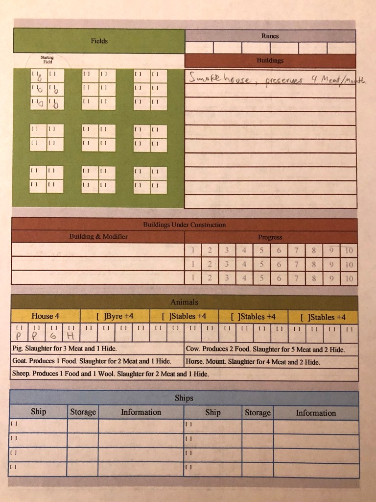 But some bad weather has gotten me sick twice now, dropping me to 4 HP (from my starting 6); I might have to rest up soon. One of the occasions I got sick was when building during a Storm, which also gave me a -4 penalty. I still managed to get a little bit of work done, but more importantly, I got the Smokehouse started. I get 1 free progress each month for having at least 5 members of the Household, and the Smokehouse will preserve 4 Meat each month. It will combo well with hunting and fishing, which is good because Eyjolf is a terrible farmer. We need to eat something.