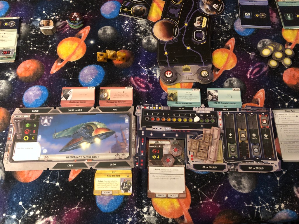 My brother took Doctor Aphra and I took Boba Fett. I went with extra firepower in my starter ship while my brother went for speed. Starting with a bounty, I immediately went investigating contact tokens. I grabbed one as an early crew, which turns out was the companion of my bounty (you know, those guys who don’t seem to like anyone in Mos Eisley). Didn’t take too long to find my bounty, but I know there was a good amount of luck involved. I’ve tried bounties before and when playing solo or 2-player, the contacts aren’t revealed enough which makes finding bounties really time-consuming. In a game that is essentially a race, this makes bounty-hunting in low player counts very luck-dependent.