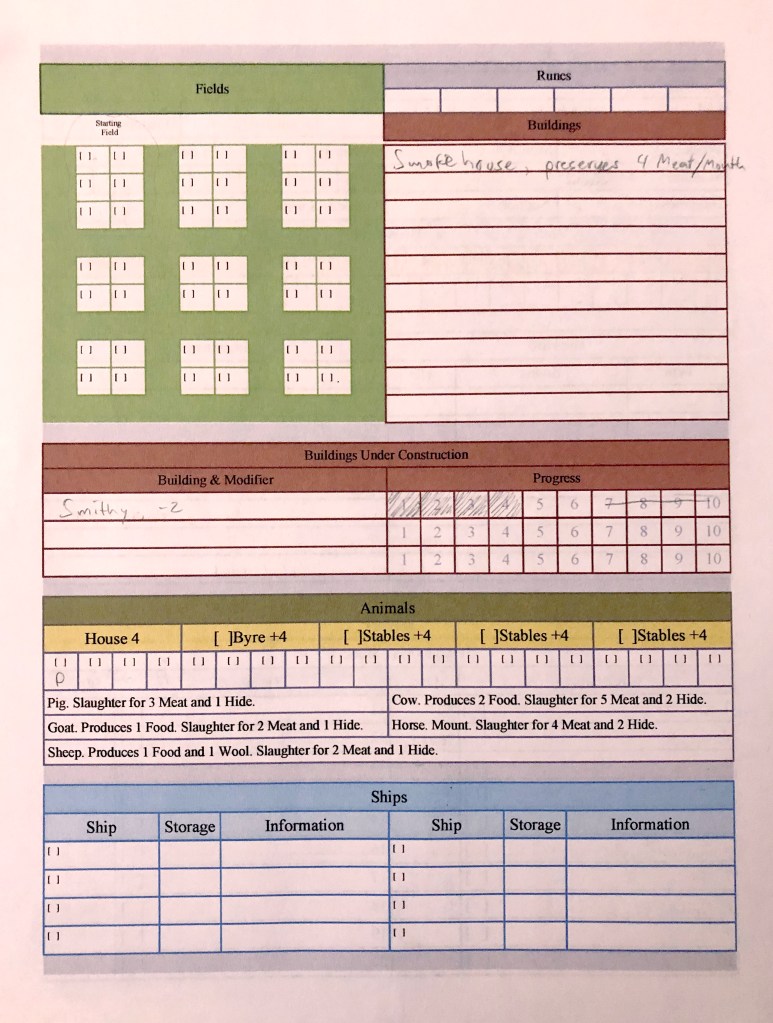 Before attempting to Harvest, Eyjolf needs some help. At the very least, a Sickle which gives +1 to Harvest. He’s also got a stockpile of Oil to sell off. To the Market! Unfortunately, he doesn’t get a very good deal on his Oil but sells the six of them for 24 silver. Still a decent amount of silver for this early. Luckily, for the available Hirðmenn, he did roll a Farmhand which gives +1 to Plant Crops and Harvest! With now 57 silver, it’s tempting to buy them and the other Bondi, a Berserker with +1 Damage (and 3 HP). But, Eyjolf only gets 4 transactions per visit with his 1 Wisdom, and the first transaction was selling his Oil. Instead, he buys his Sickle, hires the Farmhand, and buys a 1-handed Spear so he can start using his Shield in combat. Not a bad haul, and he still has 11 silver left over. It’s a good idea to keep some cash on you. A failed attempt at working on the Smithy finishes the first Week.