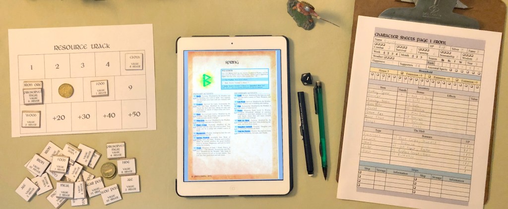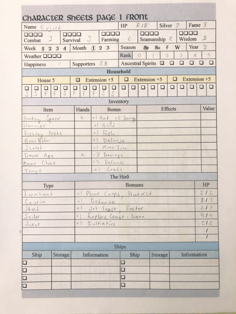 End of Month; End of Winter. No construction again, but we’ll have our Ship underway soon. We eat the last of our Food and most of our Preserved Meat. We’re a big Household now so keeping stocked is going to be a little more difficult. We drink the last of the Ale too. No Event. For End of Winter, no one is sick, so no worries about death rolls. However, our Supporters had a rough Winter and we lose 8. Back to 28. Oof. On the upside, now that we’re Fame level 3, our Supporters are tenants and pay US! We get 8 Food and 4 Silver. But then we have to pay a bunch of taxes. 10 Silver to the king. For Skill increases, it’s a tough call. But Eyjolf increases his Seamanship and Wisdom. Farming will just have to stay at 0 for a while. Maybe forever…
