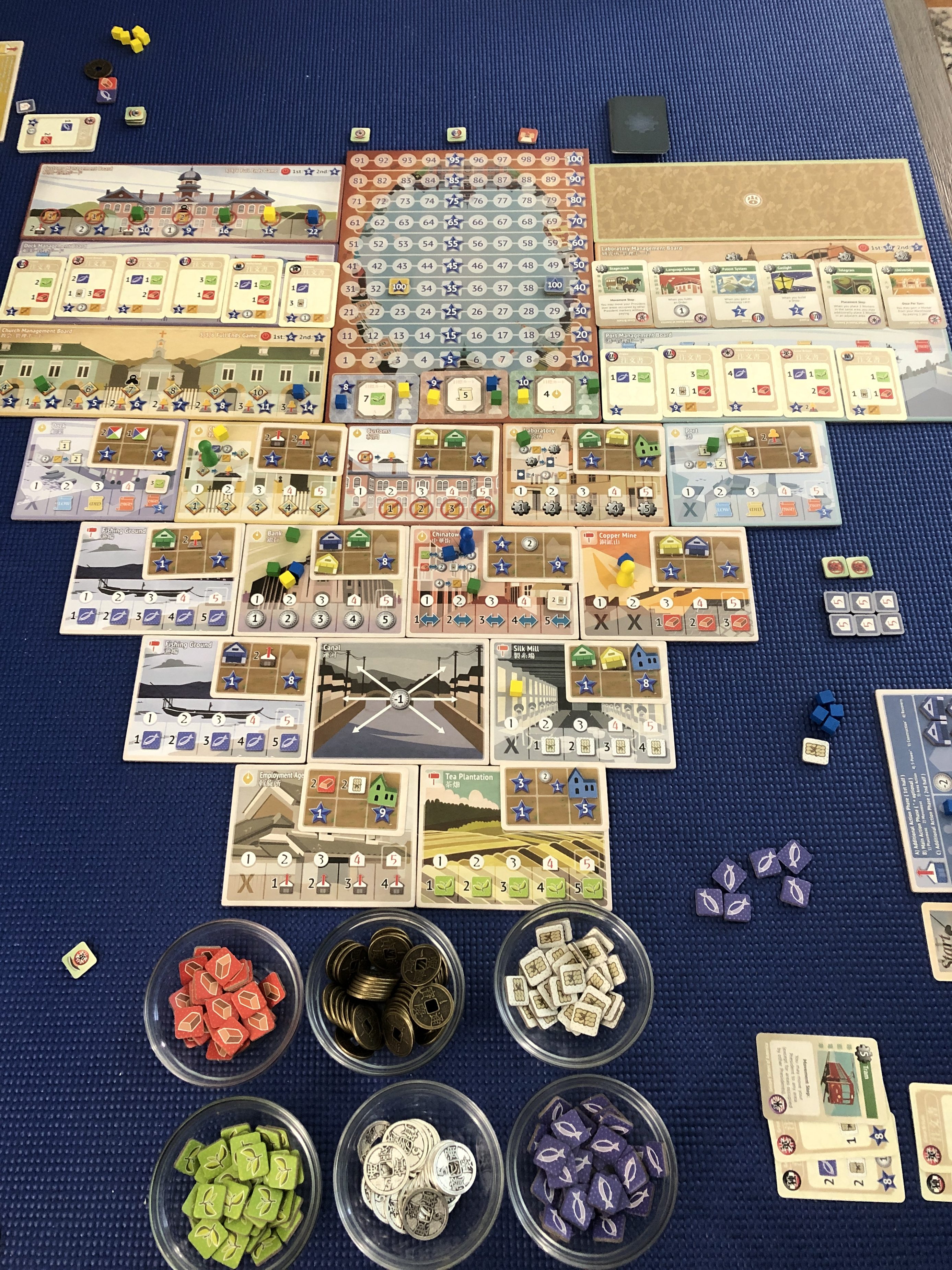There are several ways for the game-end to trigger, so you always need to watch the game state and what other players are doing, on top of them being able to get in your way (on accident or purpose). In our game, I had a chance to end the game and should have. Letting it play a few rounds longer definitely lost me the game as my opponents scored much more than I did in those extra rounds. I blame my brother. The tie-breaker is a bit strange, though. If multiple players are tied in score, it goes to whoever is closest to the start player. So if 1st player is one of those tied players, they win. But this seems kind of odd since going first in Yokohama seems to be an advantage; your first action in the game is completely unimpeded, no one else is on the board yet.