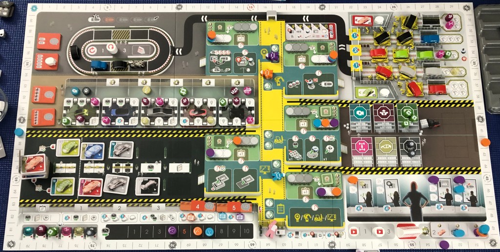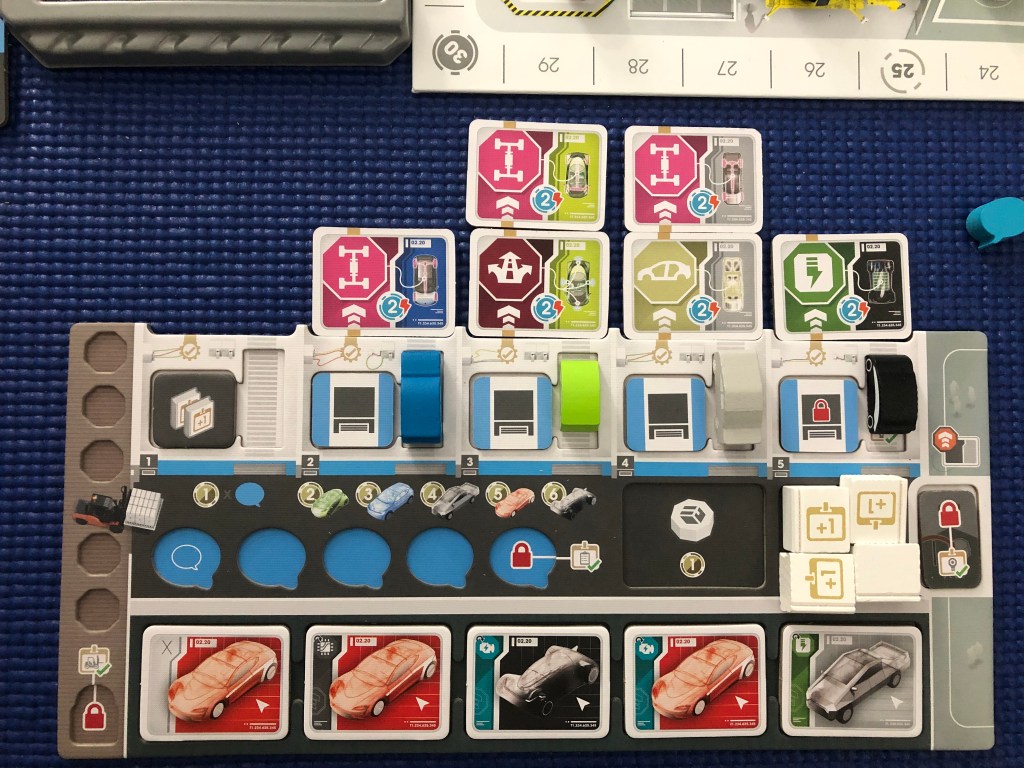 We had some interesting challenges in this game. One of the cards used to fill in the warehouse only added 2, and the warehouse was left nearly empty most of the game. We took what was good as soon as we refilled, so nothing was really allowed to build. This also meant that recycling never moved because we rarely had parts to trade. Our bonus goals were also on the tougher end. We needed 4 and 5 upgrades for two of them and 5 cars for another, and the certification track rewarded the last two levels. And for some reason, for most of the game, we kept pushing cars that weren’t in demand. So we got our speech bubbles from other sources, mostly. Somehow, we actually had plenty of speech bubbles for the meetings.
