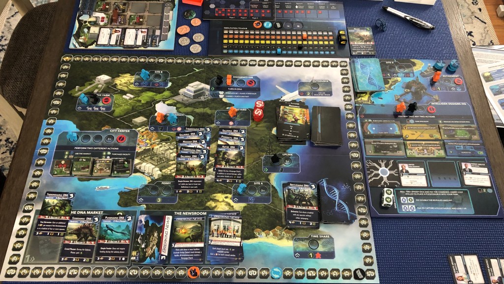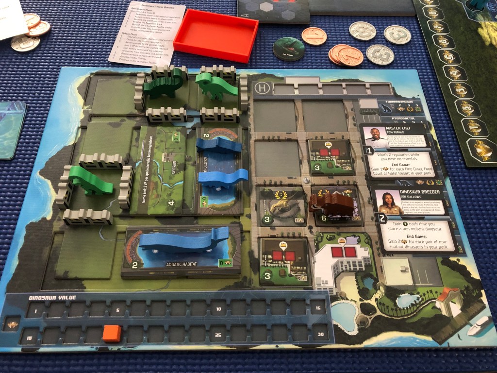 In our game, I was the first to—dive—into the aquatic dinosaurs. The Mammoth facility (with its own mammoth meeple) and animatronic rex also helped bump me into first in reputation, so I held first-player for most of the game. But my brother grabbed the private runway so he could always go to one space (for free) even if it was filled. We were all a bit slower to take specialists. It can be hard losing those Manipulation Cards since they’re really powerful. You tend to have extras later in the game.