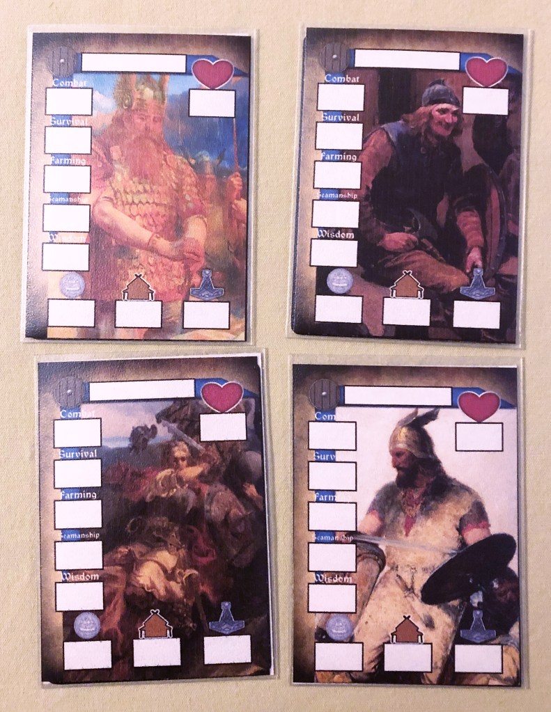 For v0.8, I made a new character since so much had changed since starting my previous character. I also decided to make some cards for various character types to go along with the printed rules I put together recently. The cards have space for their name, HP, skills, silver, population (the number of people living on their farm), and fame.