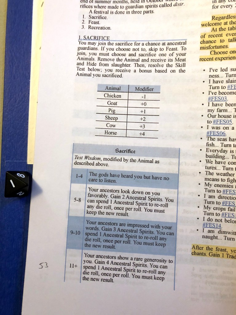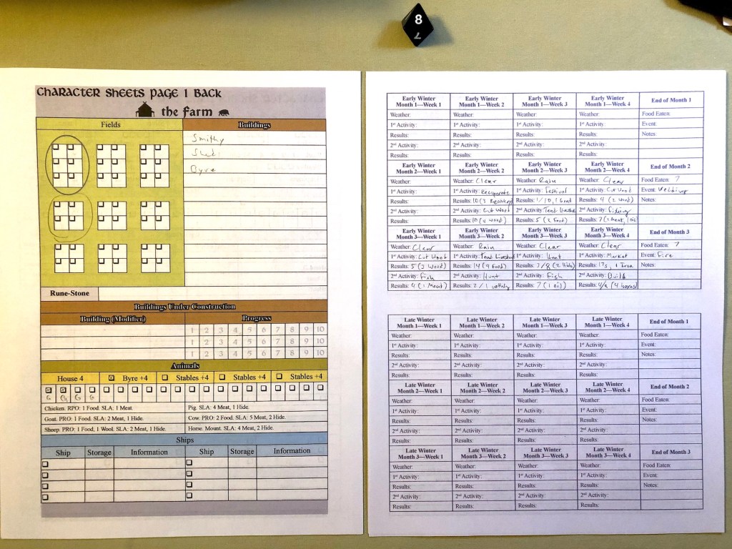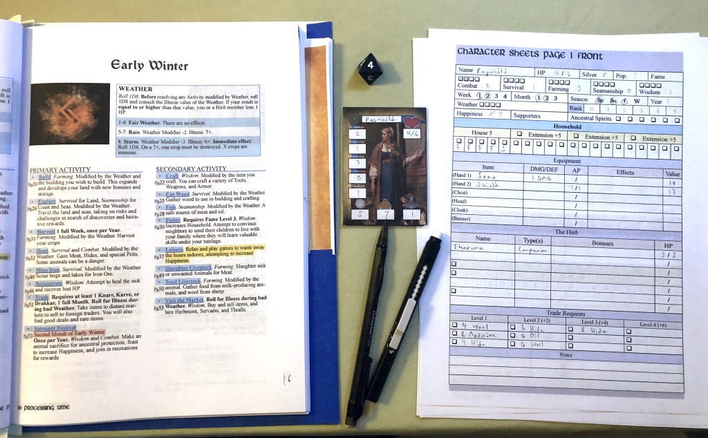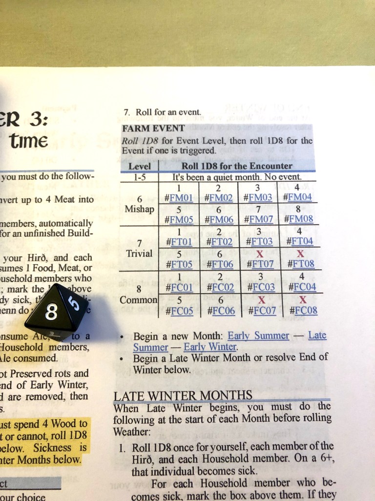 The next Week is Rain (-2 to all outdoor activities and a risk of illness). It’s as good a time as any to go to the Vetrnætr Festival, a time to commune with our ancestral spirits for protection and guidance. Ragnhild sacrifices a chicken at the festival but gets a total of 0 (1 with -1 from the chicken, a weak offering). She is not a wise woman, she’s better with her hands than her words.