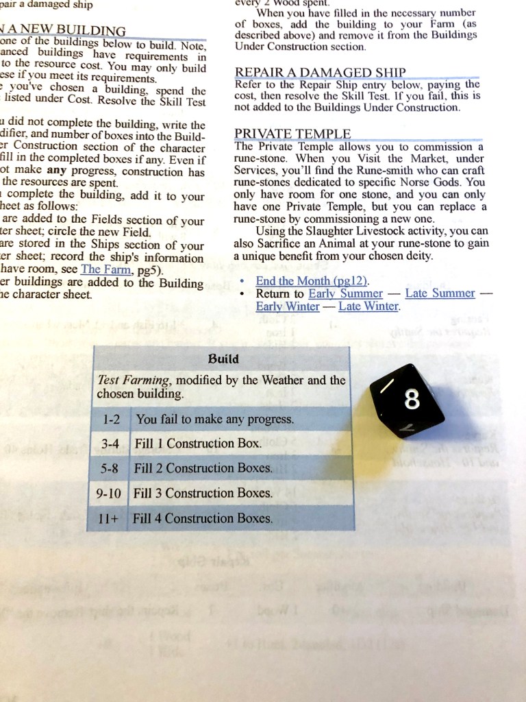 The weather clears and Ragnhild goes back to hunt. The trap fails again (and costs 2 wood each time to craft) but a lucky roll nets us a couple of small game. Unfortunately, Ragnhild doesn’t have room to take the meat, but she gets 2 hides. The fishing trip also yields 1 oil (again, no room for meat). For the last week, it’s time to head to market. On the way, we get an event, a small cave. But Ragnhild has no torches for cave-delving, so we leave and continue to the market. She gets some decent prices for the oil and hides (making 24 silver), but her cloth was valued at 75% off so she kept them to try and sell another time. She’s got enough to buy 1 iron anyway. She has everything she needs to start the Byre. Ragnhild’s last activity for Early Summer is to build. She has 3 Farming and +1 from a high-quality Hammer (which provides 1 re-roll for being high quality). Her first roll is a 4 which is okay. But she might as well re-roll since her bonuses mean she can’t get a lower result on the table (her minimum total is the same outcome). She gets an amazing roll.