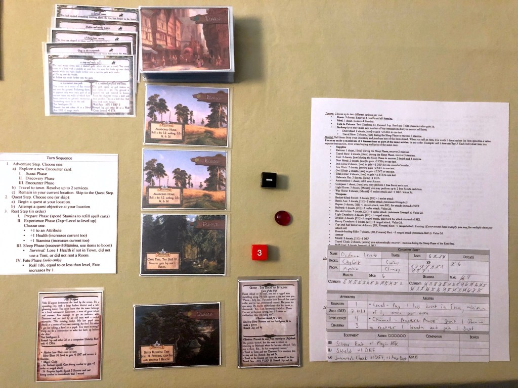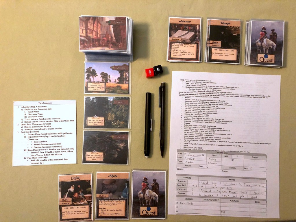 Due to some technical issues forcing me to wait on finishing the next update to my solo RPG, Winds of the North, I decided to return to working on an adventure card game I’ve been working on (off and on) for almost 4 years. I normally work on an update to the game, playtest it some, take notes, fiddle with things, then put it away again for several months. Returning to it fresh helps keep a clean perspective. If you’re too close to something too long, you start to lose sight of the fringe edges.