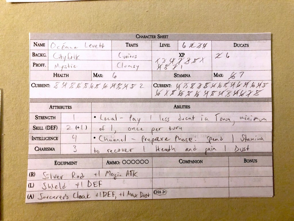 The character concept was a young woman from the city with a healthy curiosity for mysticism and magic. Meet Océane Levett, the Mystic. She is Curious (+1 Intelligence) and Clumsy (-1 Skill). She begins with an Oak Staff, useful for fighting with magic in combat, and 2 Rations.