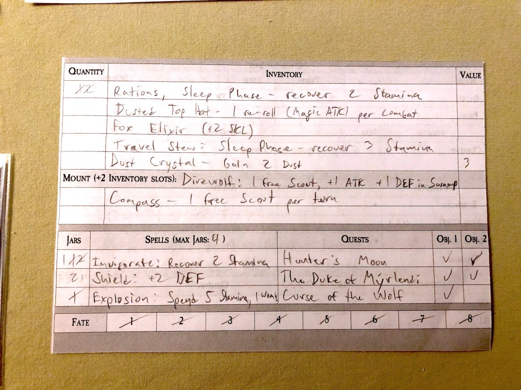 While playing solo, there are two options: play with the game’s timer (a fate track that has 8 spaces, but whether it moves each turn is based on a die roll and your level) or play in sandbox mode where you are in charge of when you stop (unless your character dies). Océane lost valuable time trying to get into the castle since I was playing with the timer. She eventually gets in, but it took all her Stamina to do it, so she heads back to town first (and also buys the Shield spell and a magic top hat). Once back in the swamp, she confronts the duke in combat (you also have the option of pledging loyalty to the werewolf duke and gaining full lycanthropy yourself, but it has some downsides). It’s a rough fight. Océane was not as prepared as I hoped, but she survives thanks to her Shield spell.