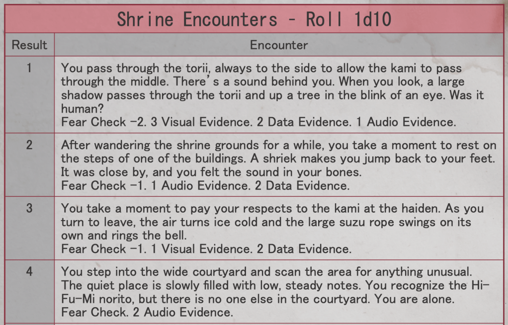 Towns, locations, NPCs, and haunted backstories are generated randomly using a series of tables, allowing for a near-endless variety of horror adventures. Seaside harbors, old shrines, mountain lodges, quiet farm towns, and many more, each filled with haunted places to explore and backstories to uncover.