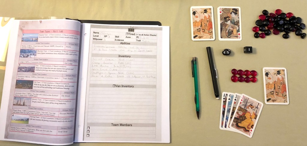 The gist of it is you travel from town to town, research haunted locations, then investigate those locations, resolving a series of encounters. Almost everything in the game is randomly generated using a series of tables. Checks are made with cards. Your Action deck uses the 2, 3, and 4 of each suit and an Ace from a deck of standard playing cards. The Challenge deck uses the 6, 7, and 8 of each suit and one 5 and one 9. When making a check, you reveal a Challenge card, then play a card from a hand of 4 Action cards. You apply modifiers based on the situation, then you can Push by discarding the top card of the Action deck and adding it to your total.