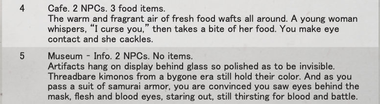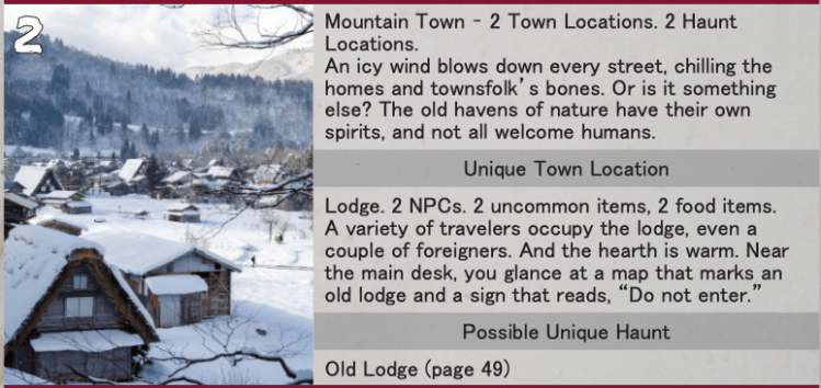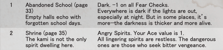 As you research the area and the local ghost stories, you’ll be filling in information regarding haunted locations for you to investigate. You need three pieces of information (obtained by rolling on a series of tables) before you’re ready to investigate a location, and each piece adds to the story.