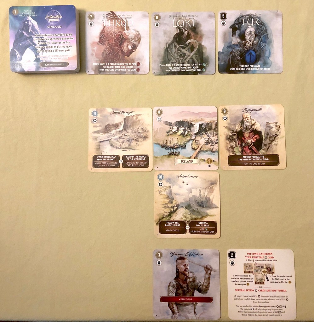 I stumbled on this new series a couple of months before they released. No one was talking about it, but it sounded interesting, and the price point is great. When it came time to finally treat myself to something, I bought the Vinland deck. It’s basically a choose-your-own-adventure style game but presented as cards in a style very similar to 7th Continent or Destinies where you explore using cards. But this series cuts down the mechanical complexity to focus on exploration and story. There are mechanics, but they’re very simple.