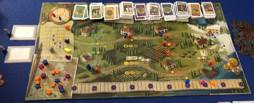 After getting my friend to try out Viticulture online, he’s become pretty obsessed with the game. He bought Tuscany, the coop version, and various upgrade pieces. We’ve played a handful of times now both online and in person.
