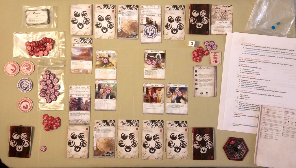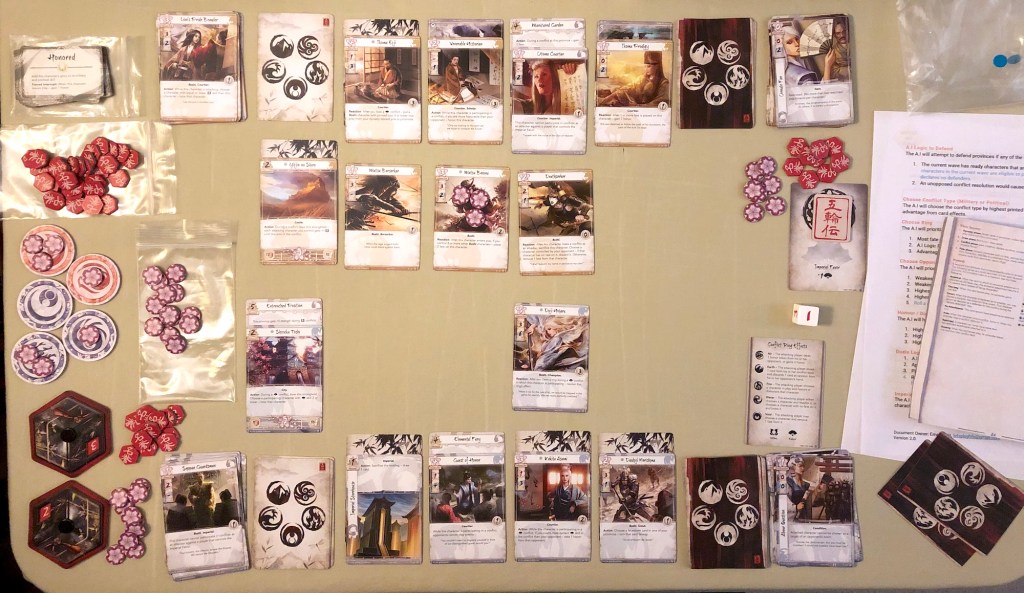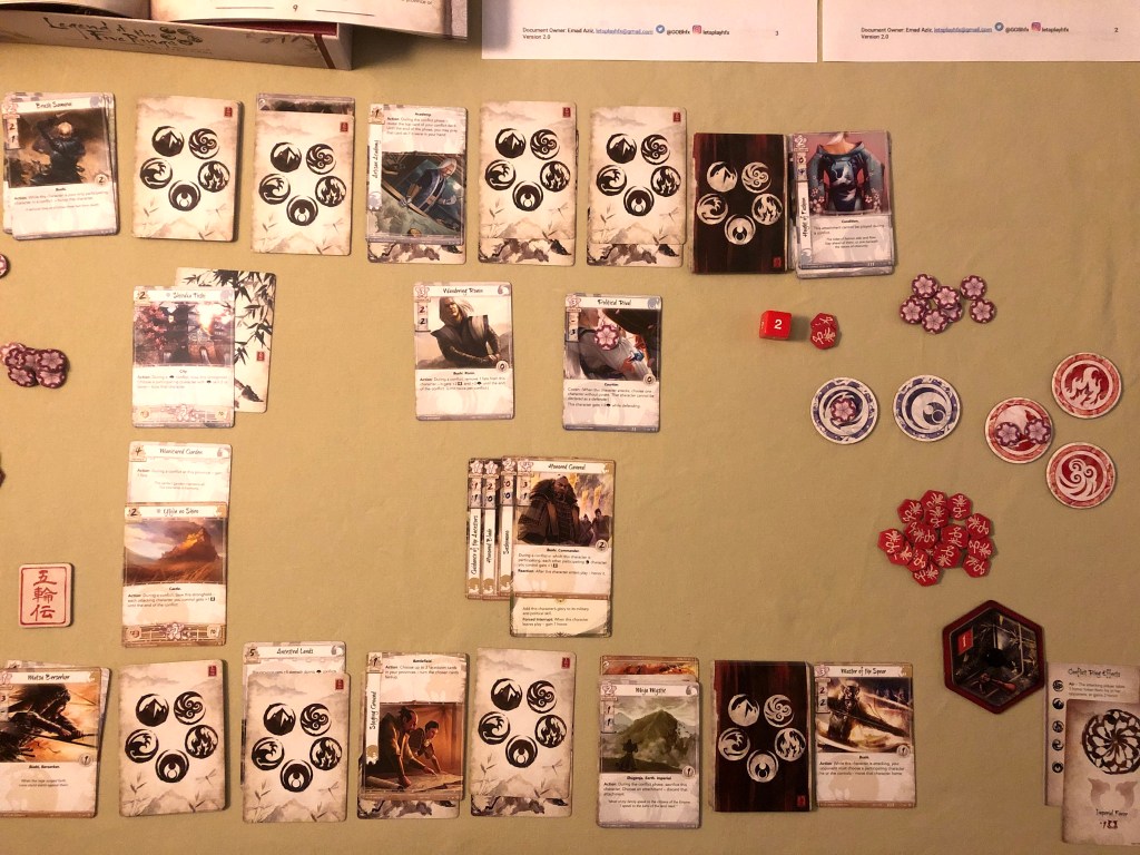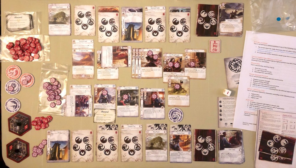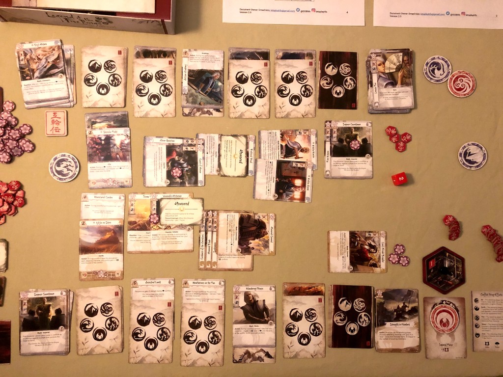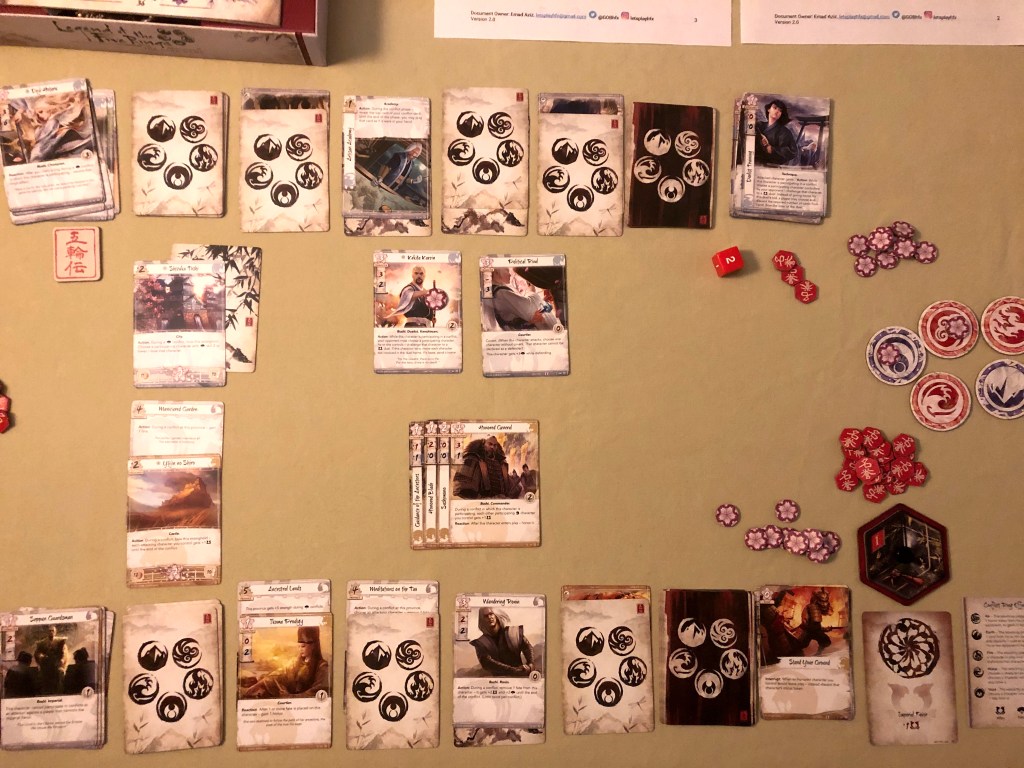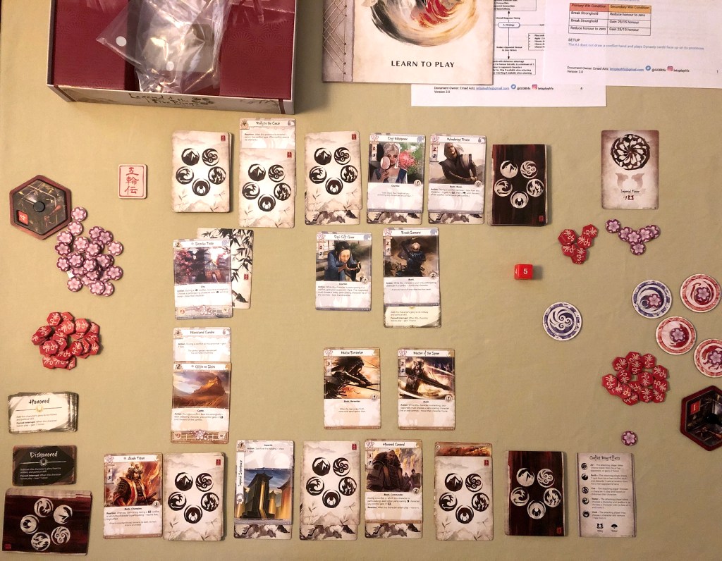My first game was a fan-made solo mode (found here). That was a difficult way to learn L5R. The rules are already a bit cumbersome, and the solo variant, it turns out, has some rules missing and some unclear parts. Learning the game (already complex) and the solo rules at the same time was a challenge. Still, it was fun. But I wasn’t yet sure if this was something I wanted to buy more of.