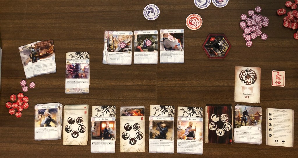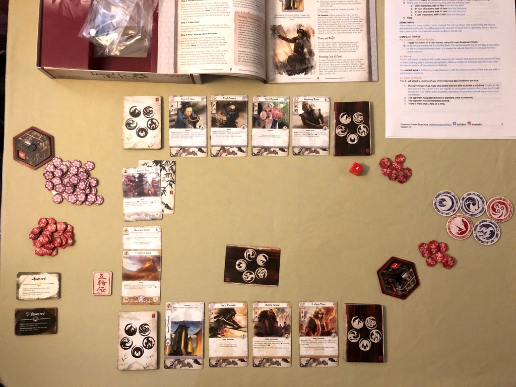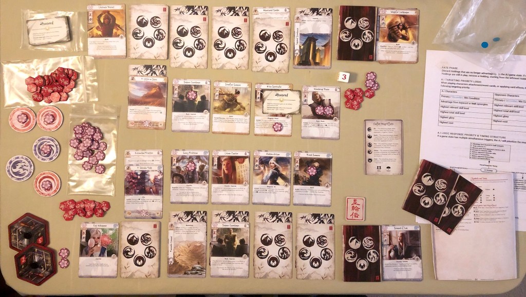 But these days, I do have an opponent to play against. But there are also more solo variants to non-solo games than there used to be. And L5R has a few options and an official coop/solo expansion (which sadly was under-printed and was sold out almost immediately). So I took an inexpensive and shallow dive into L5R with one core box. I wasn’t looking to do any deck construction, just wanted to try it out.