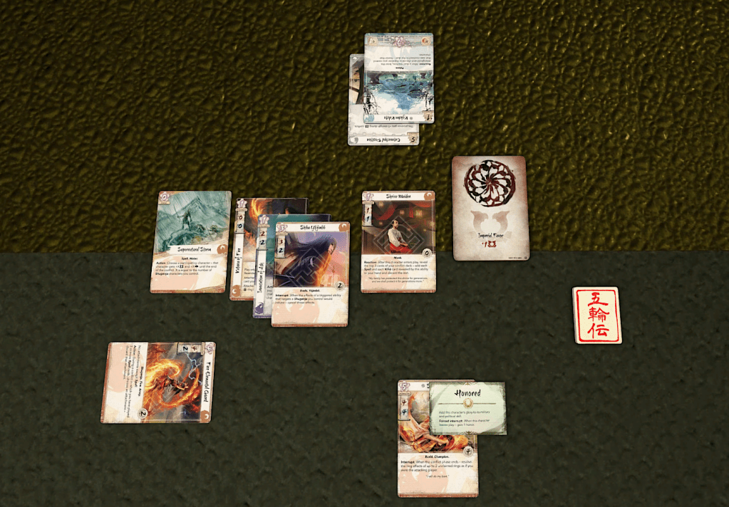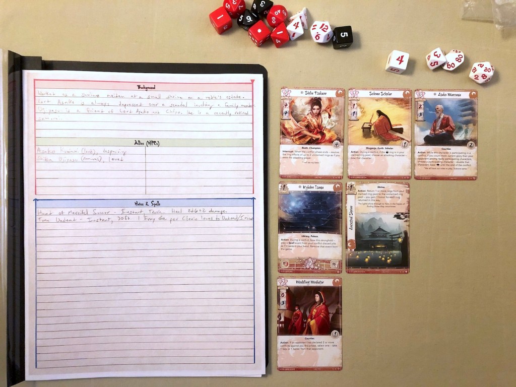 I’ve slowly been getting into the setting more as well and decided to try some more solo role-playing with the Scarlet Heroes system but using Rokugan as the setting. It worked really well, and I used some L5R cards to represent characters and scenes. I really need to get back to this, though much of my creative energy gets focused in other places (I have games to make!), so solo role-playing is tougher to tackle compared to games that are more just puzzles.