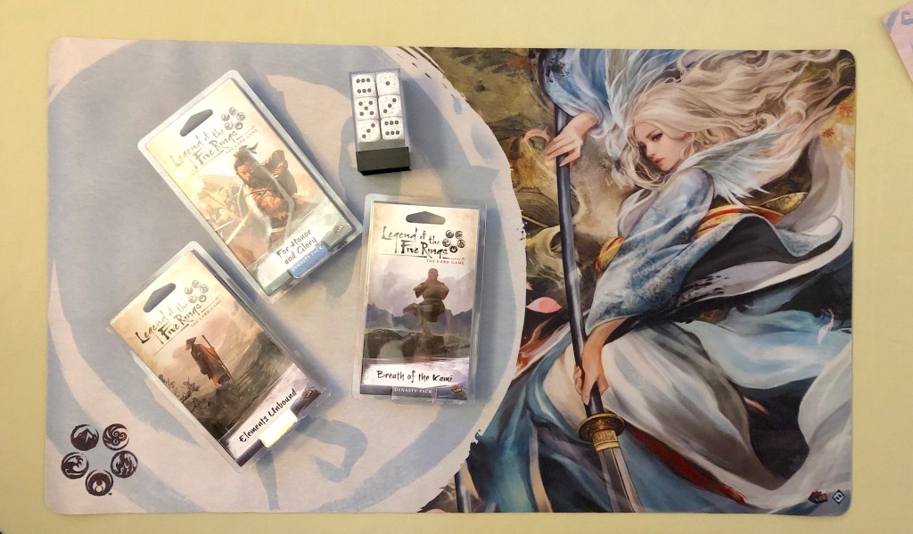 There was more stuff on sale, so I couldn’t stop myself from buying more (get while the getting’s good!). I mean, how do you pass on a $3 playmat and $5 card packs? So I bought the Crane playmat, For Honor and Glory, Breath of the Kami, and Elements Unbound. With all this, it was time to bring it back out for another 2-player game day.