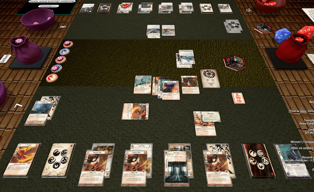 There were a number of really good cards in the new packs, especially for the two decks I made. But before playing with any of those, my friend wanted a rematch with the two decks we played last, but swap who has which deck (to see how I would play Phoenix). But since we don’t do 2-player game days very often (and I’m trying not to just pick L5R for game day constantly), I looked into us trying out a Tabletop Simulator mod for L5R so we could play online. I found one that has most of the cards (doesn’t seem there are any complete mods) and rebuilt the two decks.