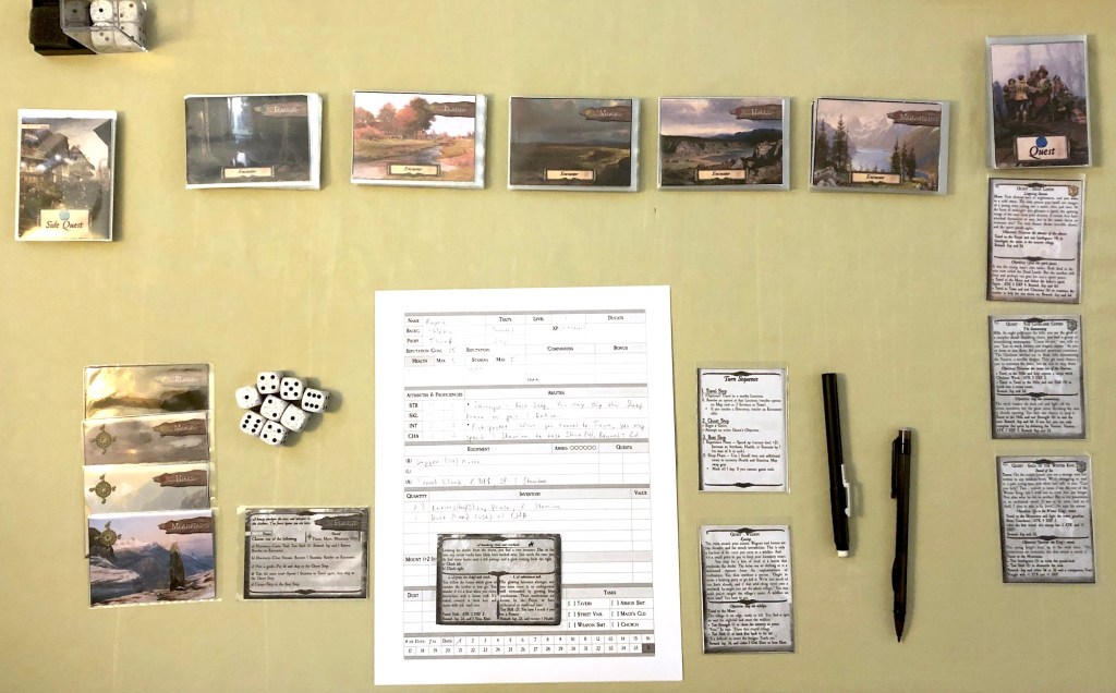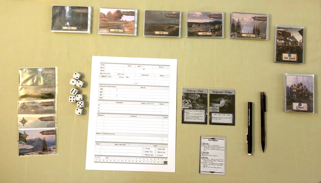 The basics of the game: You make a character by combining a background and profession, giving you abilities, attributes, some starting items, and a starting quest. You begin in the starting town and can go do whatever. As you travel the map, you can resolve encounters, discover new towns, fight enemies, and attempt quests. In some towns, you can purchase businesses and improve your business. In the most difficult regions, you can look for bounties. All this is to earn Reputation. You have a limited number of days to earn a pre-determined amount of Reputation (which you choose during setup based on desired difficulty).