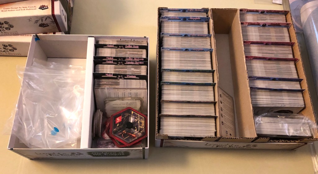 After adding to my collection and making an insert for it to better store everything, I wanted to make new decks and play some more while the rules were still fresh. My friend also let me hang on to his core box and add them to the collection (for easier deck building).