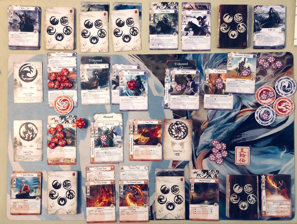 We had another 2-player game day, and L5R was first up. This was our first time with custom decks I had made (though I let my friend pick which clan he wanted to play). The decks were Crane/Dragon dueling and honor against Phoenix/Unicorn spells and ring manipulation. I used my friend’s cards too so the decks could be a bit more focused with some of the core box cards. Sleeves and little pieces of paper helped separate them.