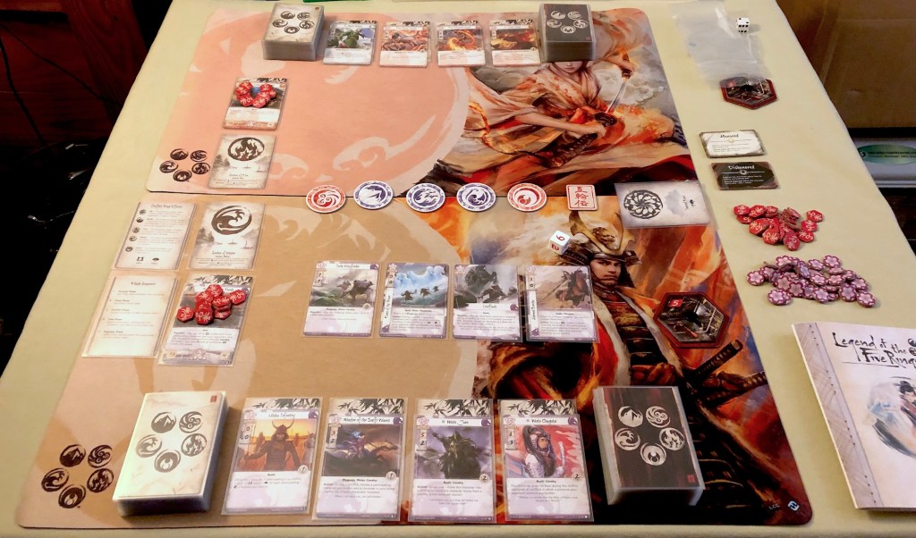 Setup. I’m using the Lion playmat because I don’t have Unicorn, but they’re both very aggressive, military-focused clans. The Lion playmat was actually a gift from a BoardGameGeek user.