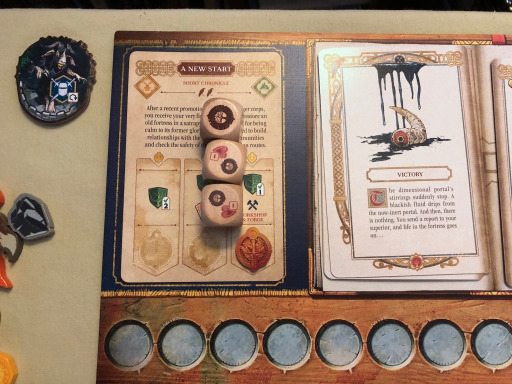 For Halloween, we brought this one out and tried the scenario featuring a haunted keep (“Things Were Better Before“). It’s a “long” chronicle, but the game was still roughly 90-120 minutes. We could have played more efficiently, and one problem card gave us some trouble because it needed 2 gold but we had spent the last of the money, so we had to grab other resources, go trade them for coins, and then clear the problem. It cost us a few turns because it was covering fire which we really needed.