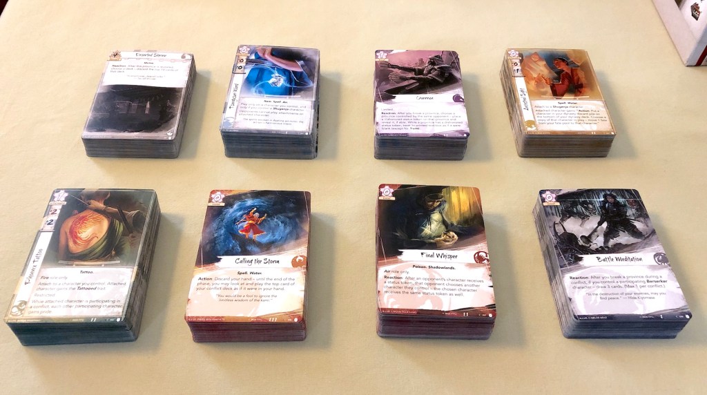 1. Thanks! Yeah, L5R is a tough one to get into. Very complex, and the written rules are hard to digest. I only played a little Call of Cthulhu, hence my collection is very small, but it was a really neat game with genuinely unique feel to it. I’ll have to see about playing it multiplayer again. The fan-made solo mode didn’t really work for me.