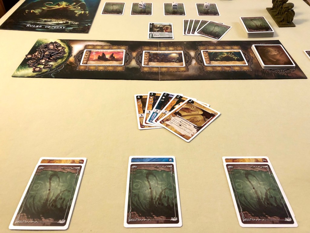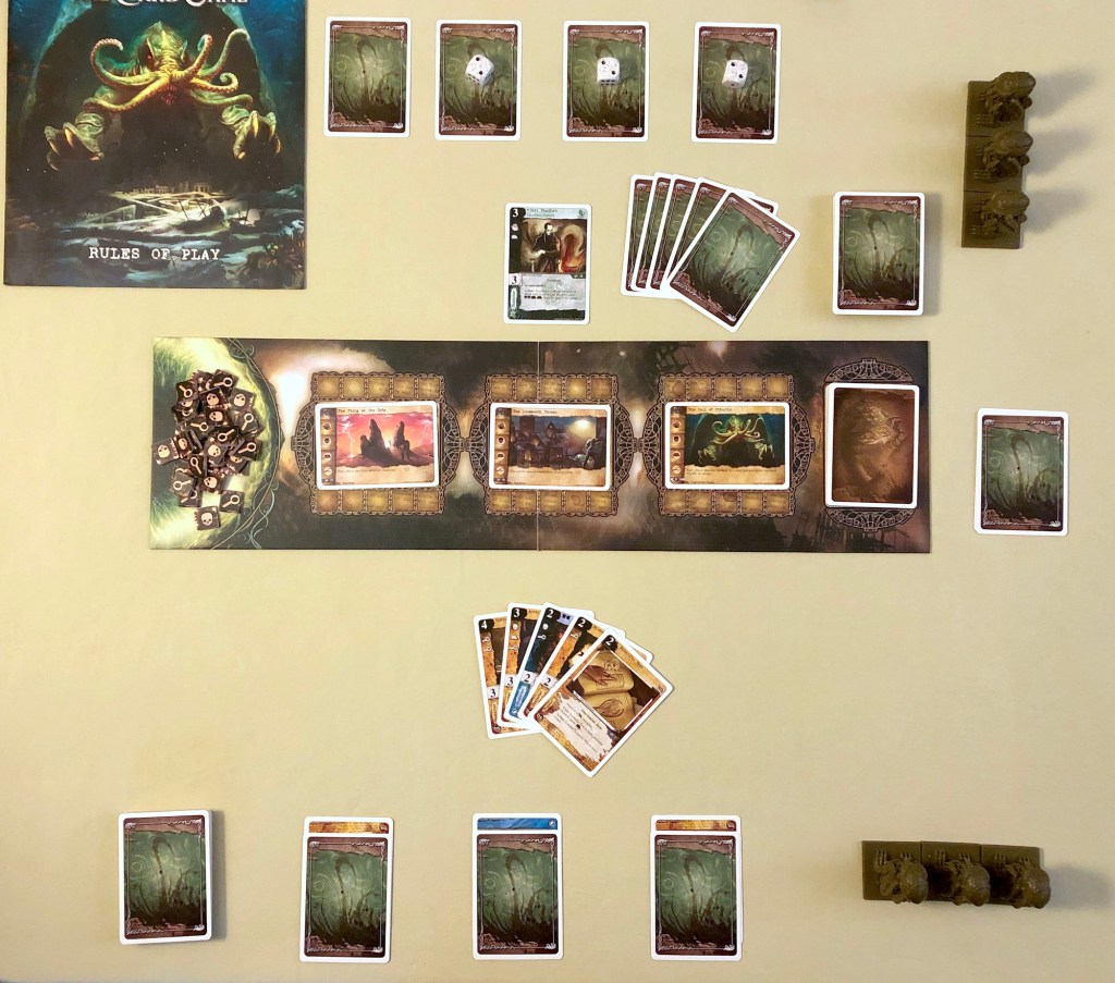 It was a rough experience. The Cthulhu Rising solo rules are a bit of a mess. Typos and errors, terminology confusion, very unclear writing, and not well organized. On top of that, the mode seems to be meant for playing with a larger collection with fine-tuned decks. I only have a bit outside the core box, and the jumpstart the Minion bot gets was such a huge hurdle to deal with that I ended up throwing in the towel after about 30 minutes of fighting over 1 story, struggling to get any headway.