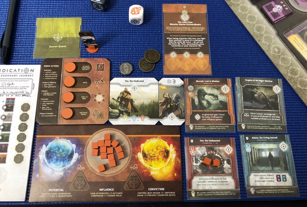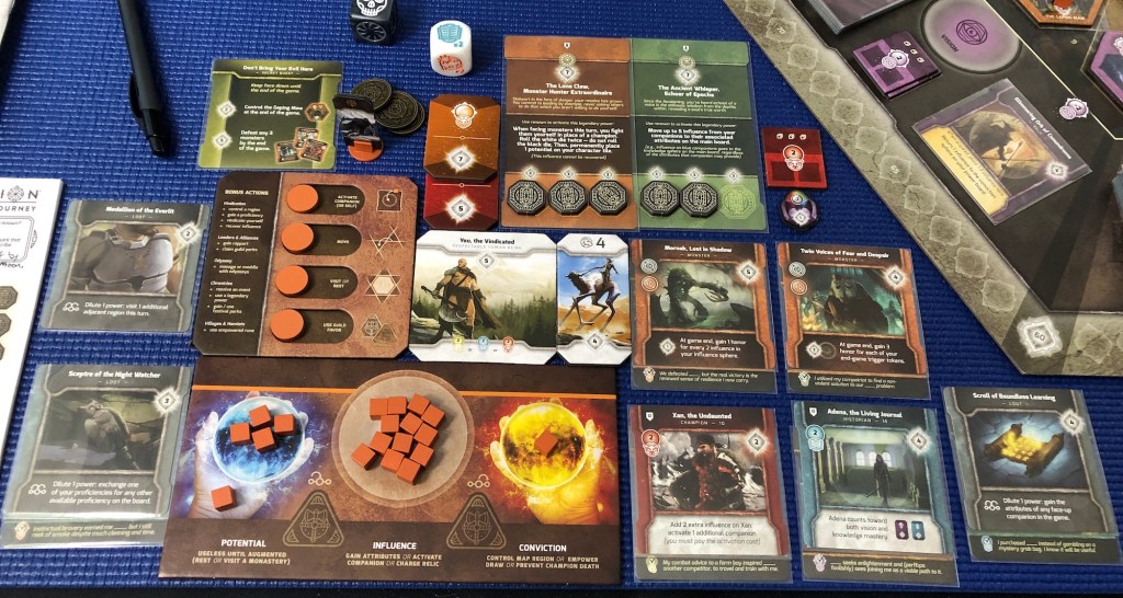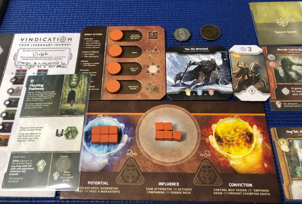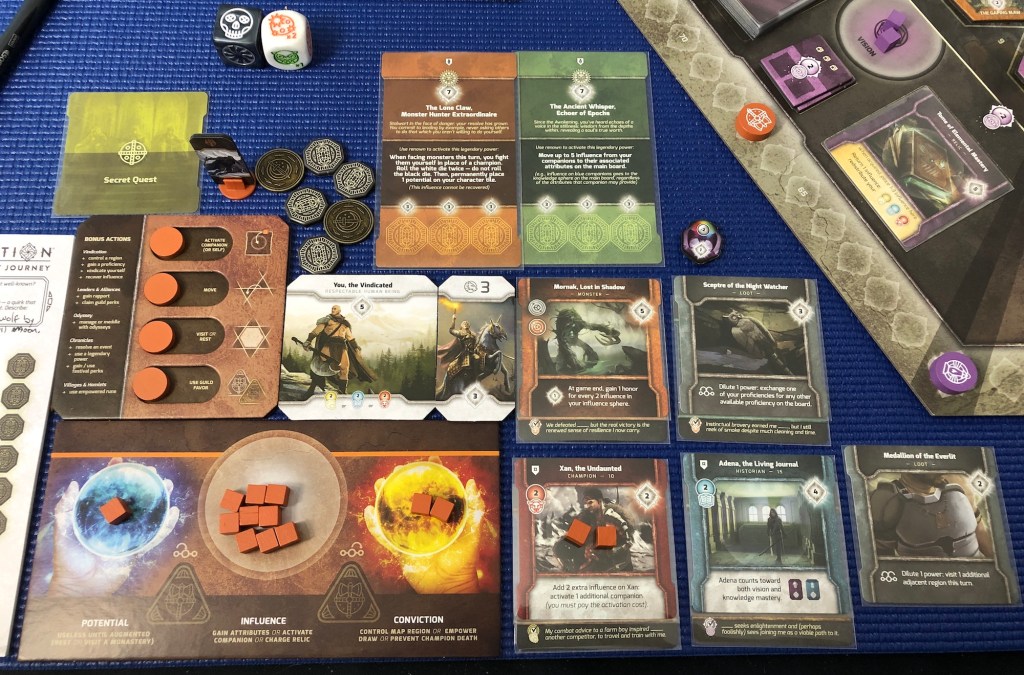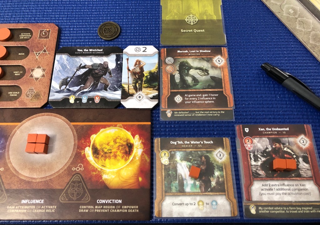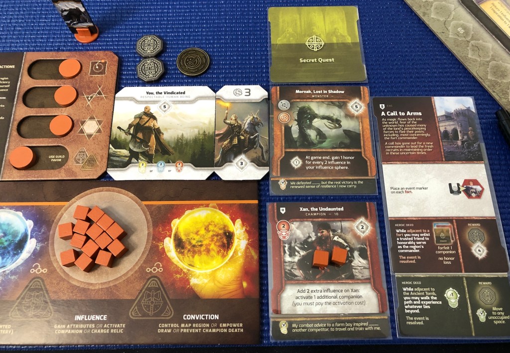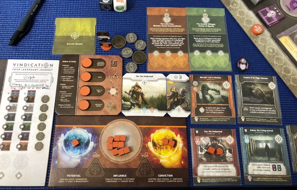 The game is pretty easy to get into. It’s essentially in the same line as Ghost Stories and Last Bastion but with a focus on narrative. Instead of just fighting off monsters, the cards you have to widdle down are encounters with story and choices or tests. There are also scenario cards that add new objectives every now and then, and winning or losing is based on the scenario objectives, not just surviving. It’s a fun game, and I like that the scenario is only part of the experience, so I don’t think replays will feel stale. We’ll see.
