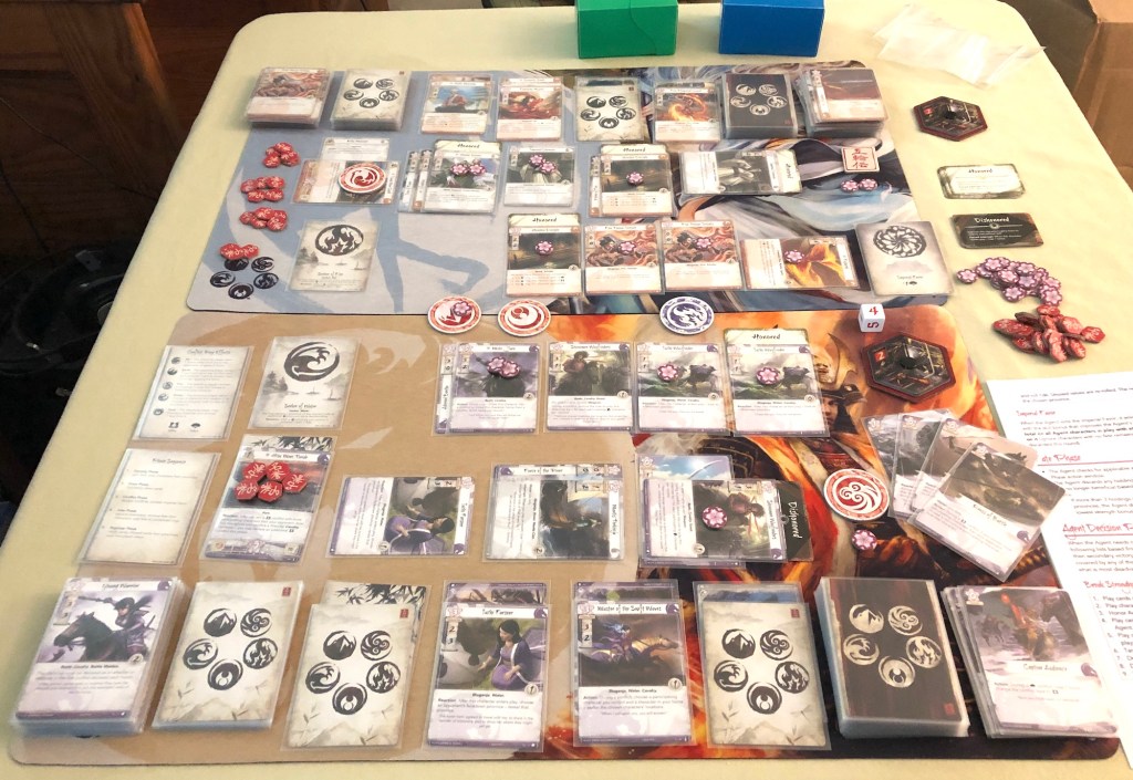 The new solo rules (and adjustments) made for a much more intense game. The Phoenix clan broke 3 of my provinces and rebuffed some of my attacks. But a really close final round allowed me to break a 3rd Phoenix province and attack their stronghold in one round. It was close!