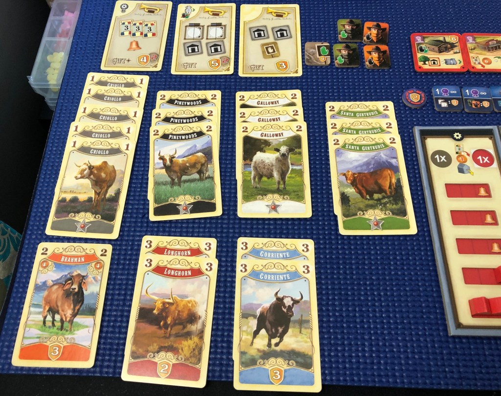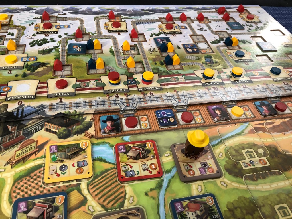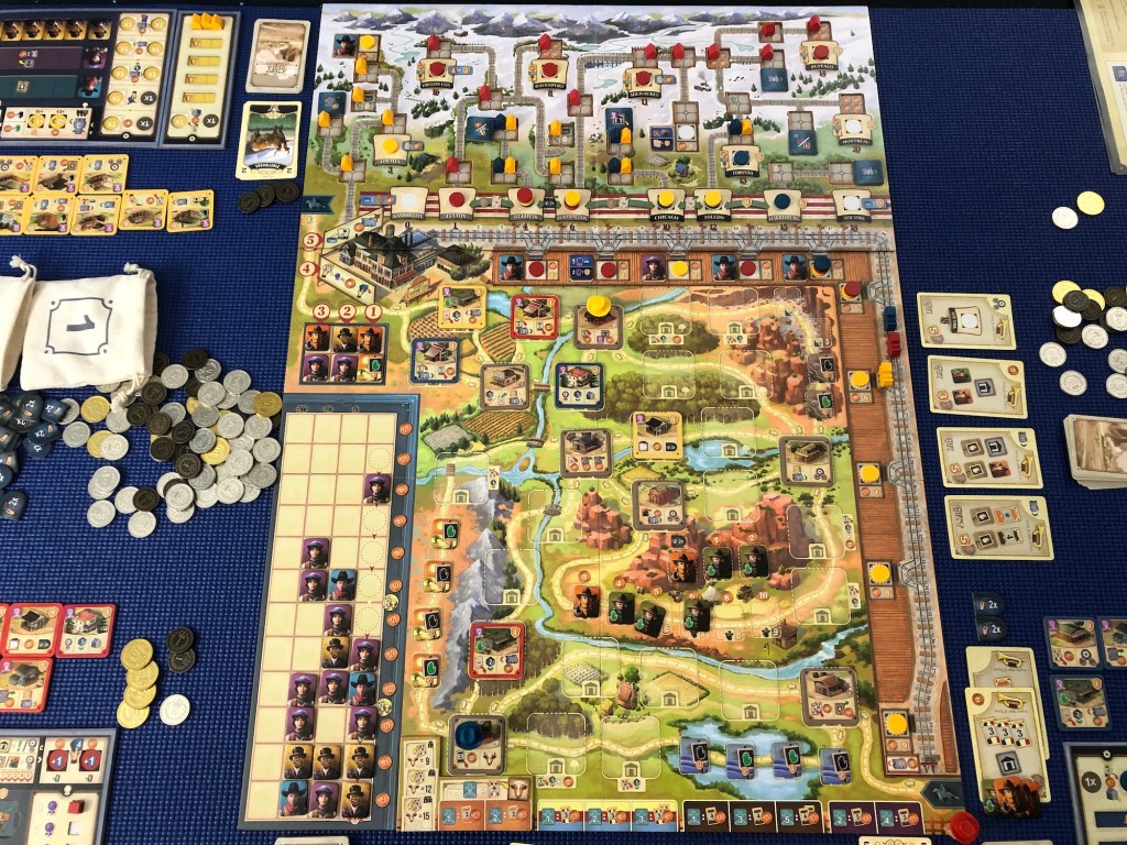 We were apparently in a mood to try expansions to games we’ve played before. This was our third game of GWT. Our first time was with the original edition a long time ago. Then we played with the much nicer 2nd Edition, and I liked it a bit more (there were some balance changes in addition to a huge aesthetic upgrade). The Northern Rail expansion replaces the basic rail track at the top of the board and adds new stuff to the game.