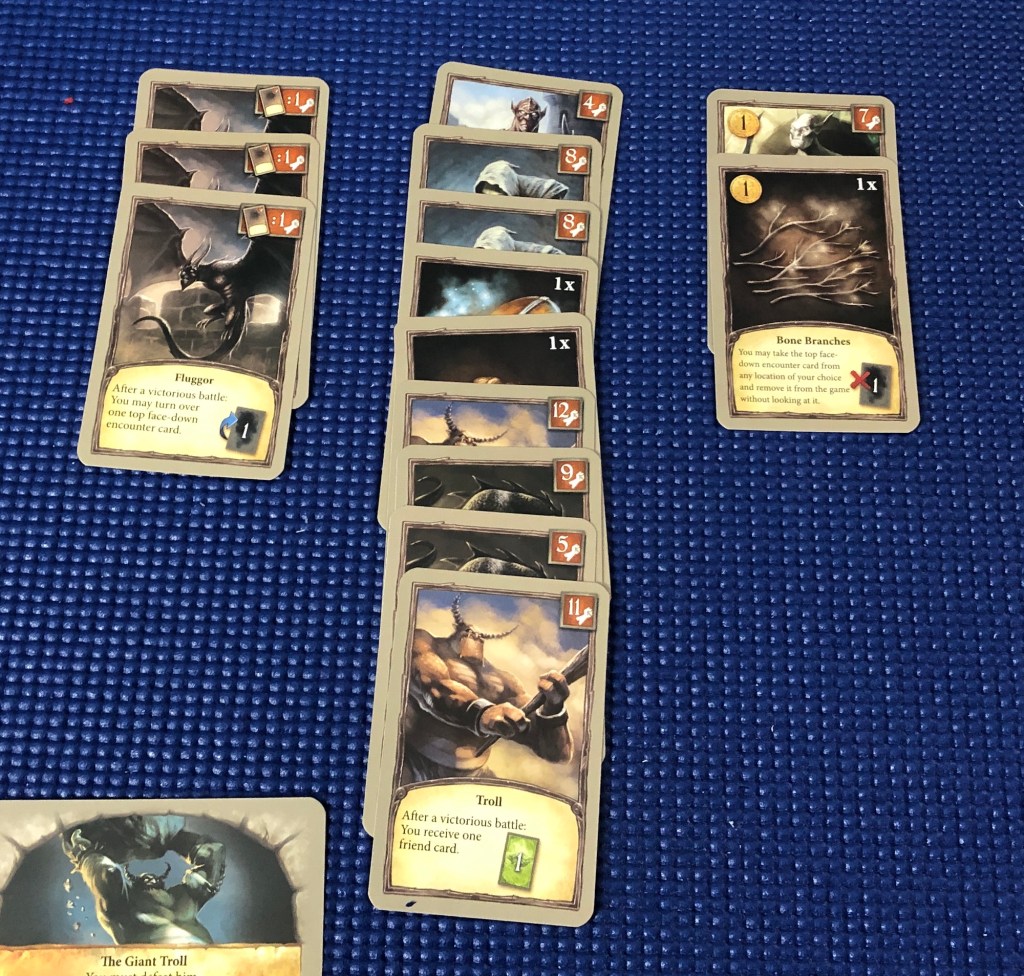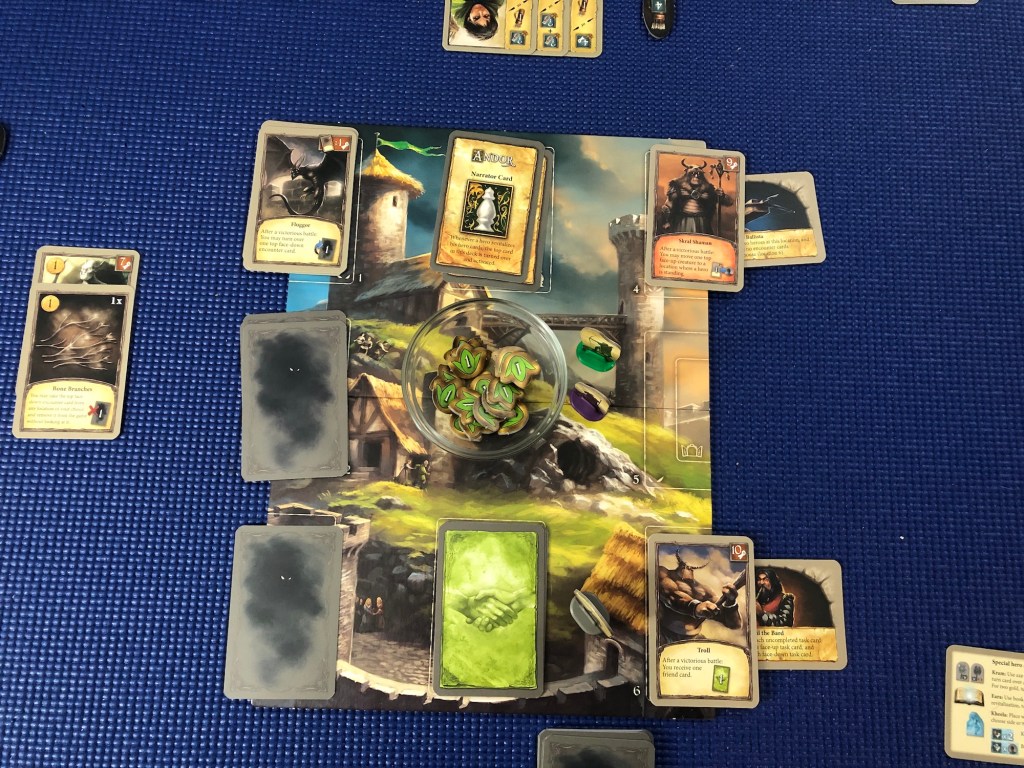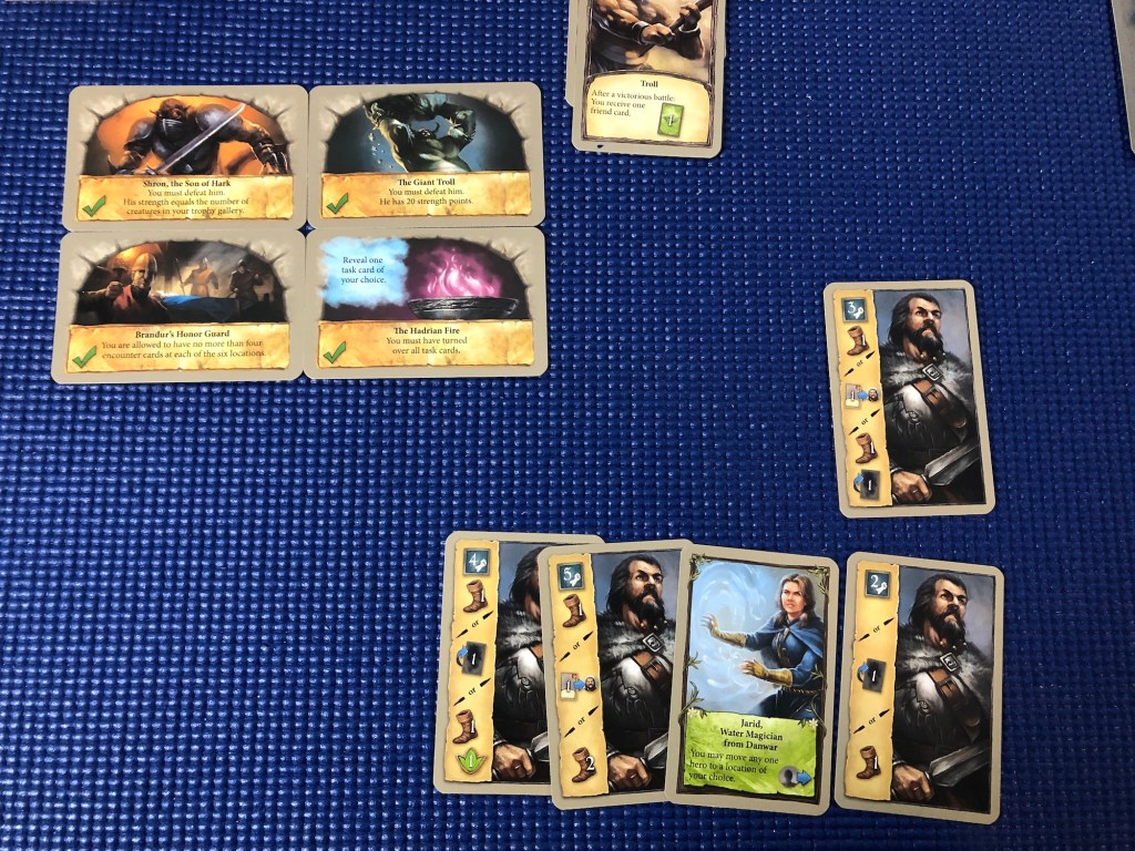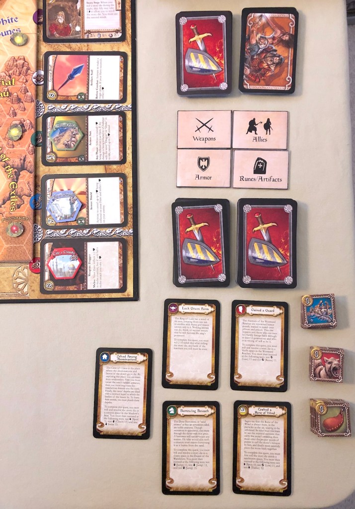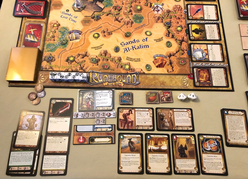 I’ve played it before in the BGG forums (a group of us played Runebound for years) but this was my first play of a physical copy. Thankfully, my copy seems to be a later printing that corrected some errors, though other oddities seem to come from a lack of playtesting. Regardless, it was a lot of fun.