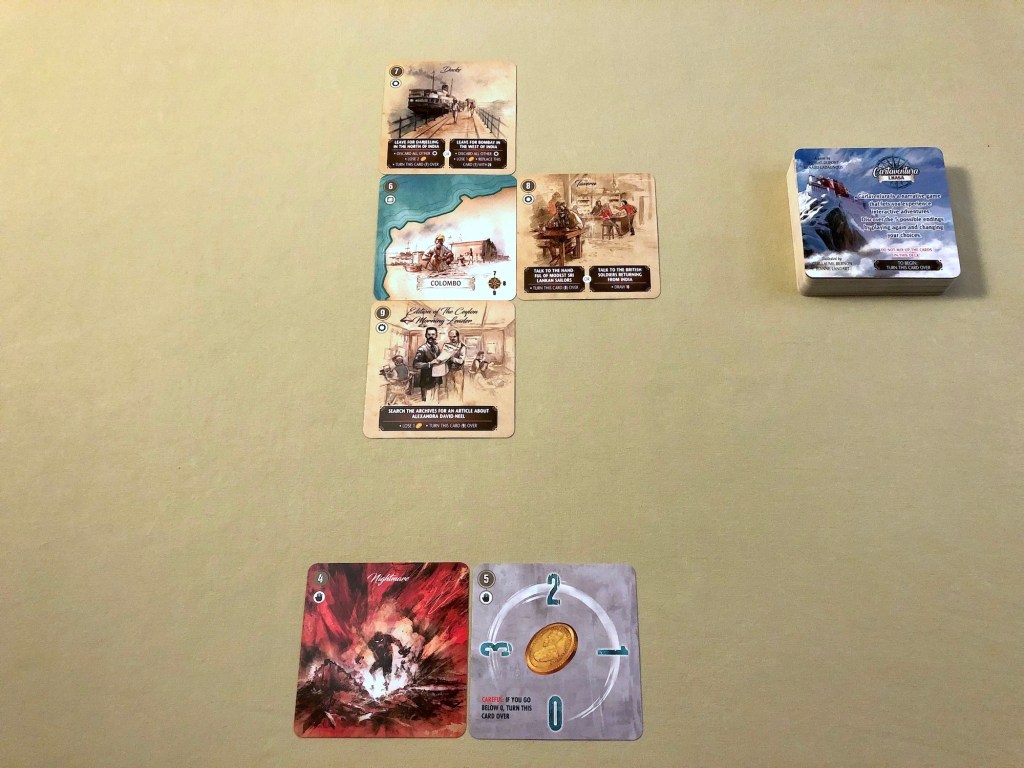 Lhasa was the next one I tried. You’re a reporter traveling India and into Tibet in search of Alexandra David-Neel (a real, historical woman with a crazy life story explained in the history pamphlet they include in the game). I’m glad to see that each one brings a unique mechanism to the series in addition to a change in setting. Without going into spoilers, it was pretty interesting to see, even early in the game, how differently the paths might go. And the amount of history is fun to explore in these. I wish there were more historical gamebooks!
