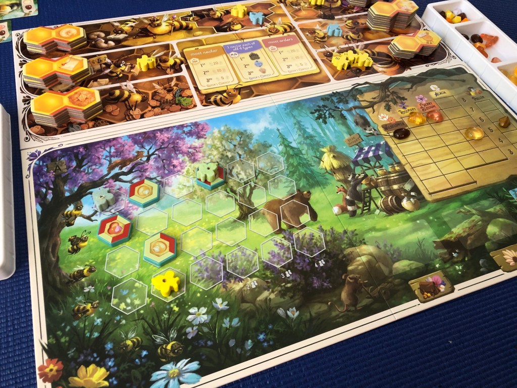 Honey Buzz is much more streamlined and plays a lot faster. The spacial puzzle is pretty satisfying, and though there’s some pretty hefty luck with the orders, it seems bad luck can be curbed by selling honey at the market if it’s not coming out in the orders. The theme doesn’t do anything for me, but I’d happily play again.
