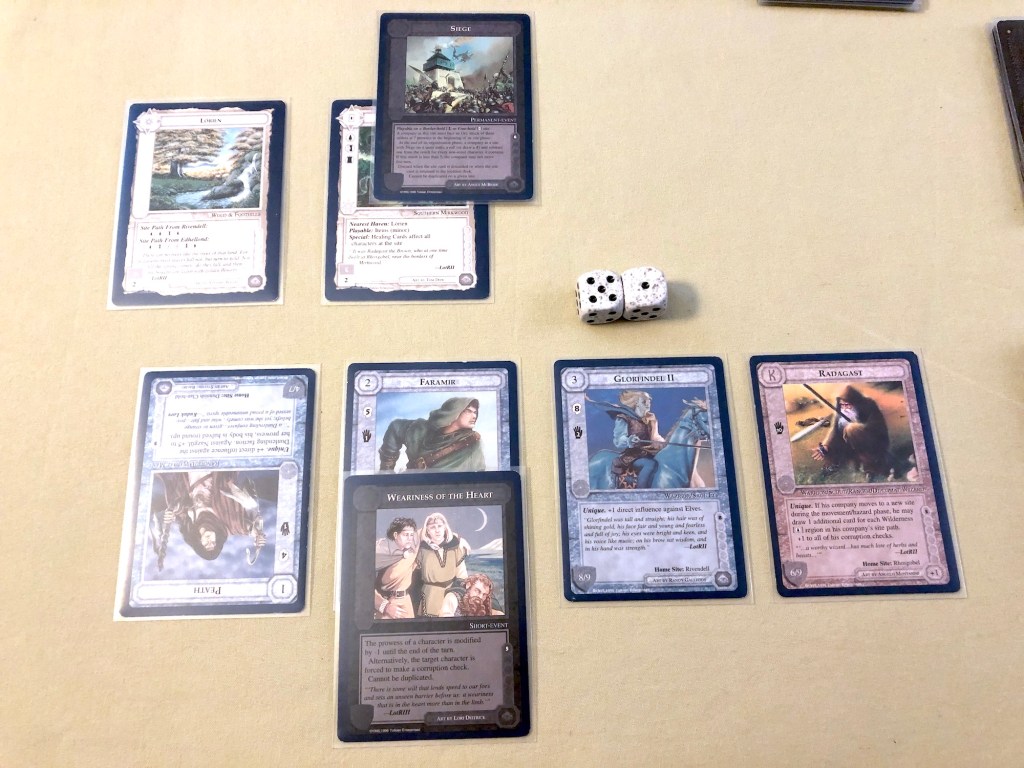 Poor Kili got discarded from a corruption roll early on (snake-eyes!). Radagast was able to help, but a Siege had the company for a good handful of turns, unable to escape the siege. Ended with 19 points, just about as much as the deck has! Which is fine since the recommended point total for basic starter decks is 18.