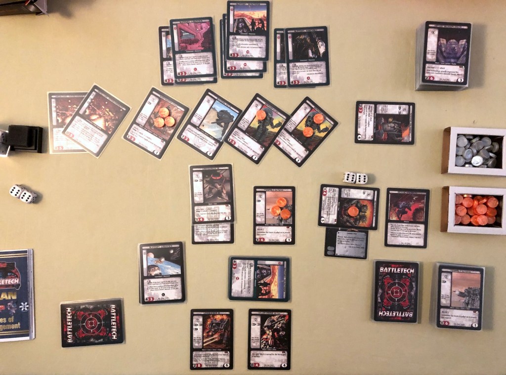 Finally! It was time for a 2-player game. Unfortunately, we didn’t have time to finish, but it was mostly over. My friend was getting the hang fo the mechanics but not necessarily the nuances of when to attack or block and with which ‘Mech. He’s still new to this style of game, and this was probably more complexity than he was ready for (a different kind of complexity than he’s used to in heavy Euros). Regardless, we both enjoyed it. I’m still on the lookout for good deals on more, but there’s not a lot out there for it.