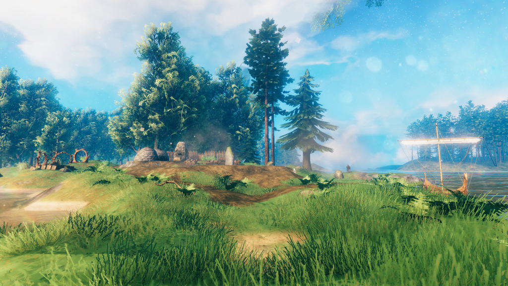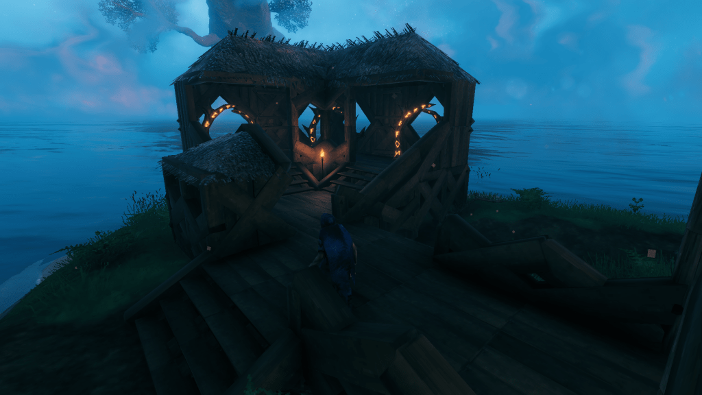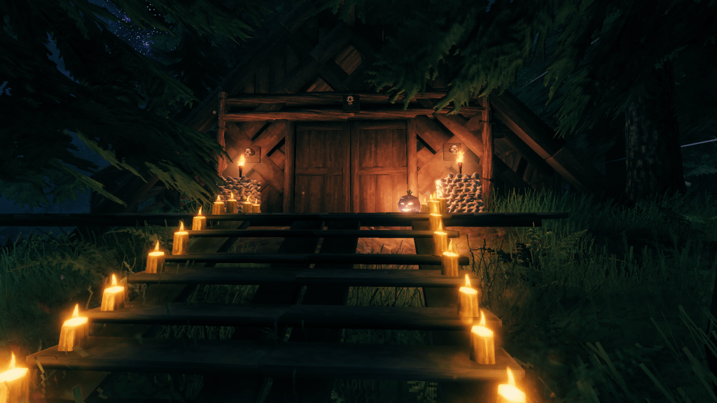 The concept was to go back to a somewhat more traditional Viking longhouse, but suitable for my needs in Valheim. I also wanted a full dock and a lighthouse. That’s not too ambitious, is it? But before I got to all that, it was Halloween, and I made sure to decorate appropriately.