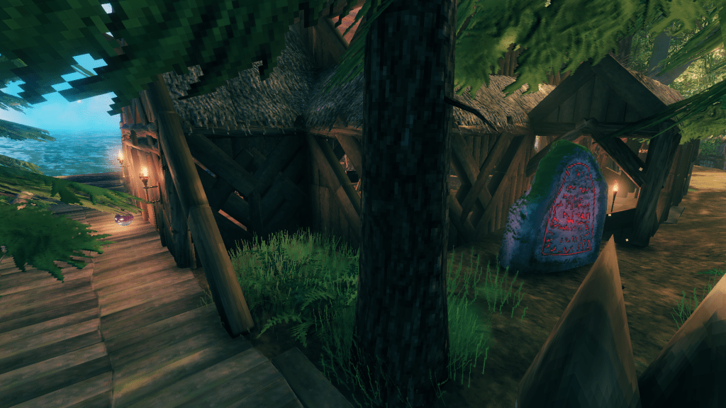 The lighthouse worked! It’s a touch on the small side, but functions. But the docks came out great. The warehouse holds the carts which have tons of storage space, and I built everything spaced far enough that carts can be taken from the docks to around the back of the house by either side. And part of planning the second house at this location was figuring out how to fit the runestone into the layout because there’s no way to remove them. Also, they’re cool and I wanted to keep it.