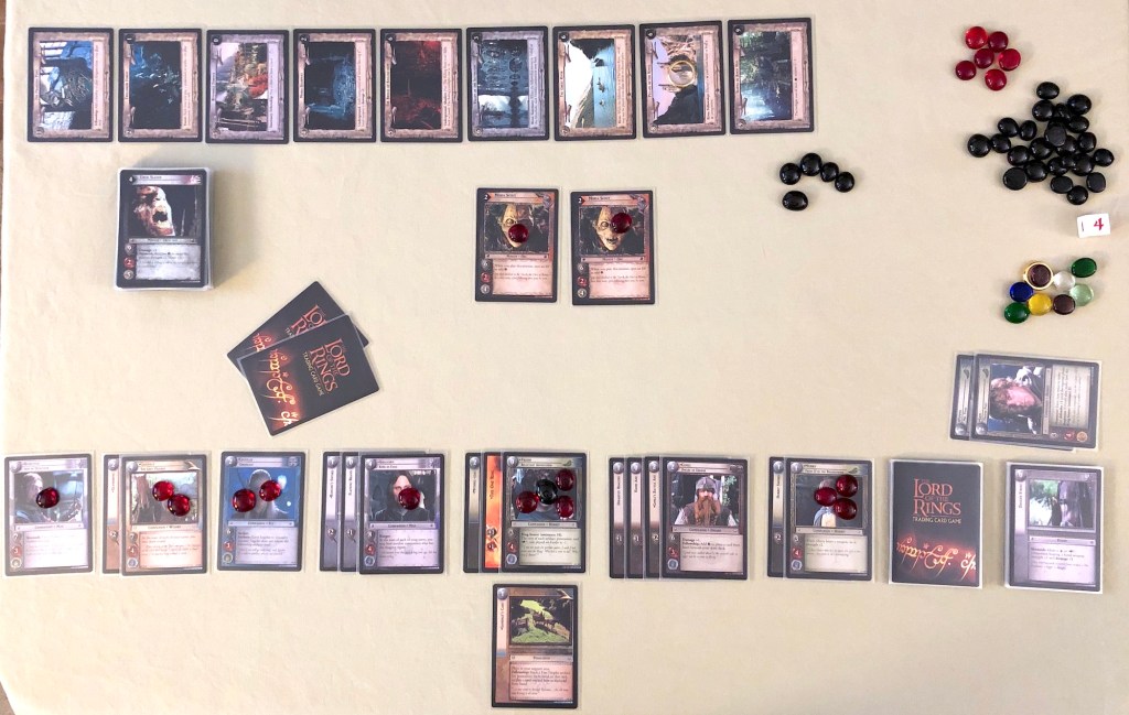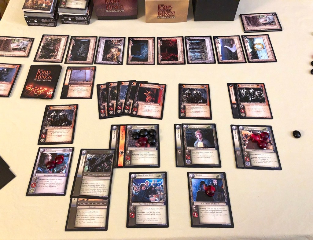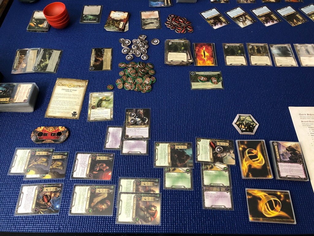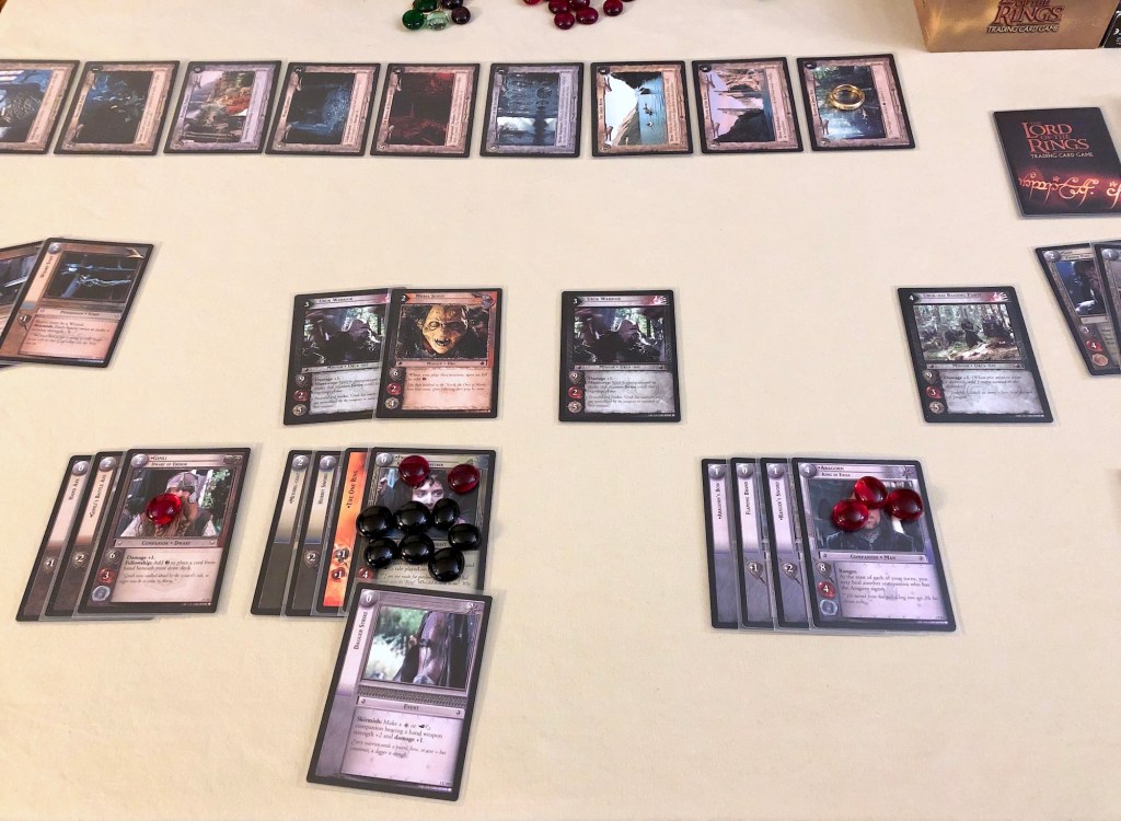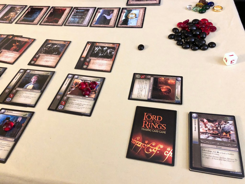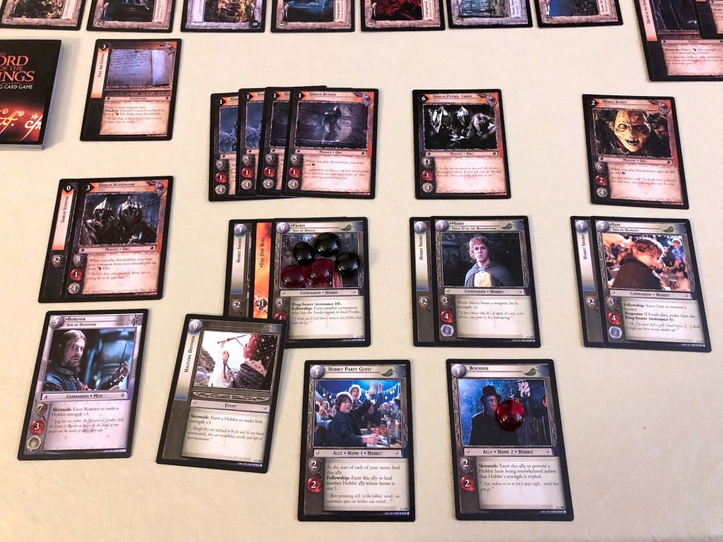 I also played some more solo games. After messing with more starter decks, I decided to make a deck that was the whole Fellowship. It was a very silly deck fighting against a Shadow deck that mixed all the major threats from the movie (Nazgul, Moria orcs, and Uruk-Hai). After the first run of the deck, I made some adjustments. It’s fun but silly.
