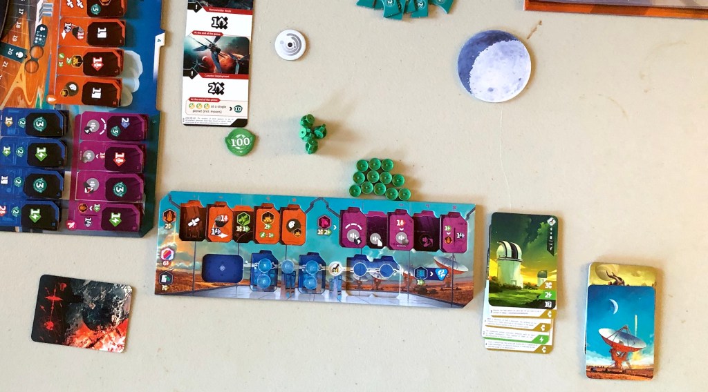 It’s got a lot going on, but it doesn’t take too long to get the hang of it. The flow feels a bit like Terraforming Mars; taking actions until you run out of things to do, then drawing cards and getting income to ready for the next round. But SETI isn’t really about building an engine, though you have several areas where you can improve actions and increase various incomes.