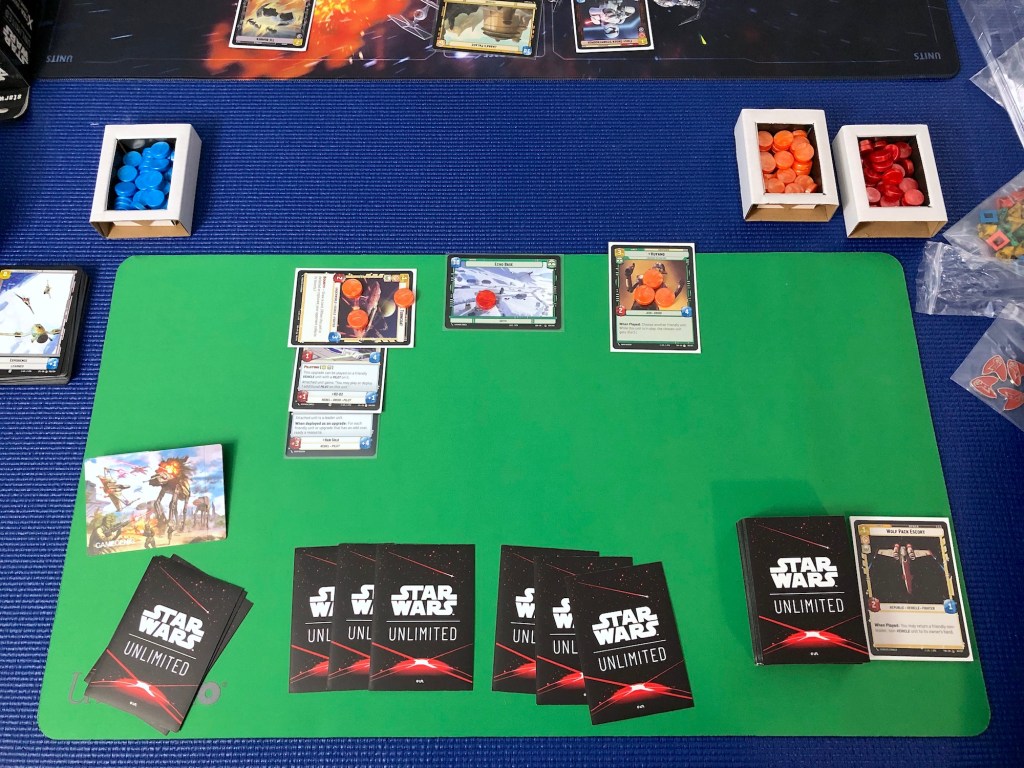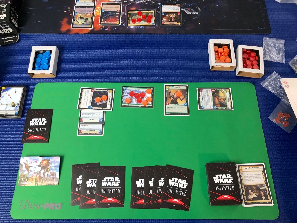 We played some more with the spotlight decks, this time swapping decks. My friend wanted to play the Boba Fett deck since the Han Solo one was trickier to play. Things were close (ignore that he already removed the damage from his base in the second picture), though nothing like our epic match with our sealed decks. We also opened the booster box and some packs, so we’ve got two sealed decks ready to go for next time.
